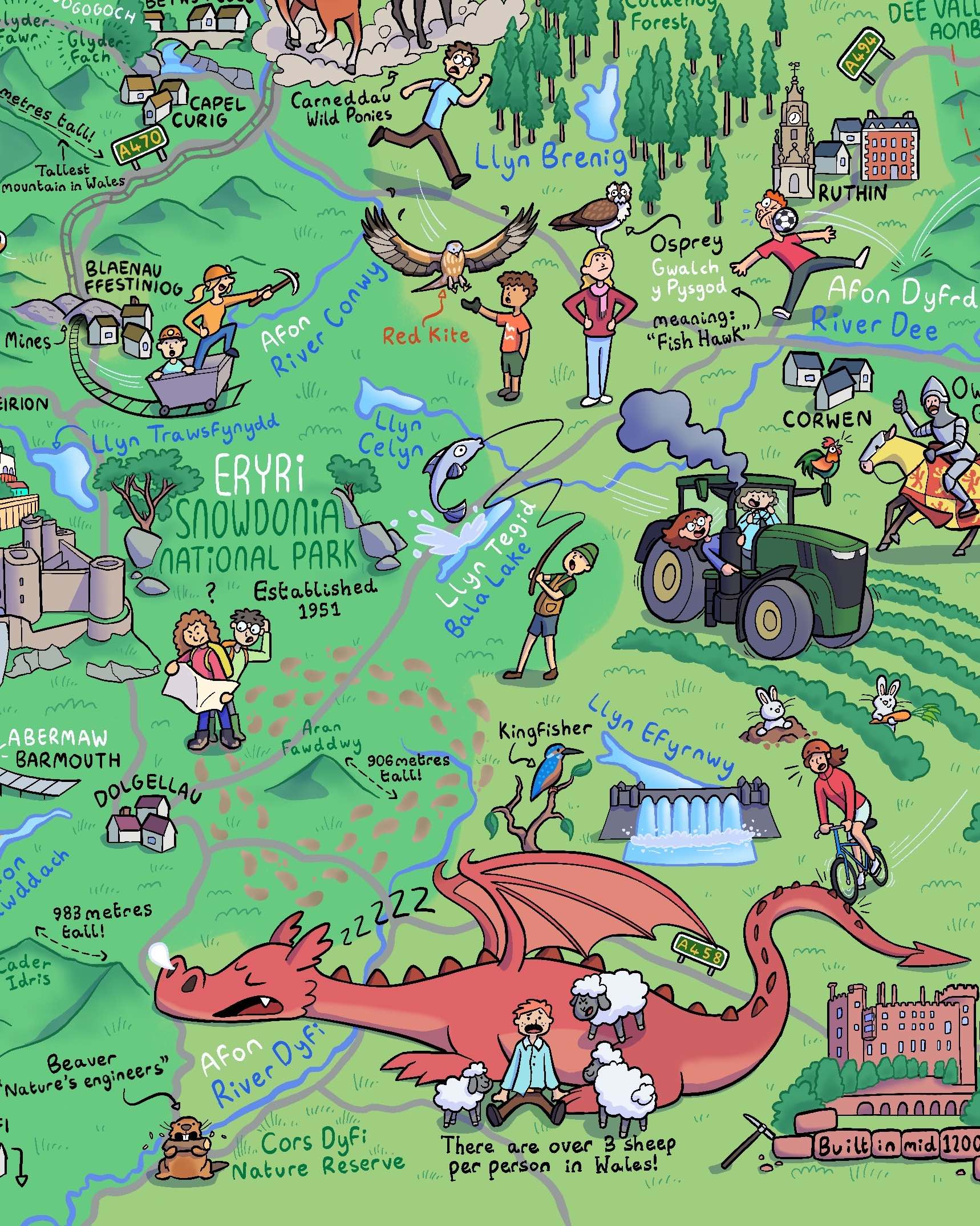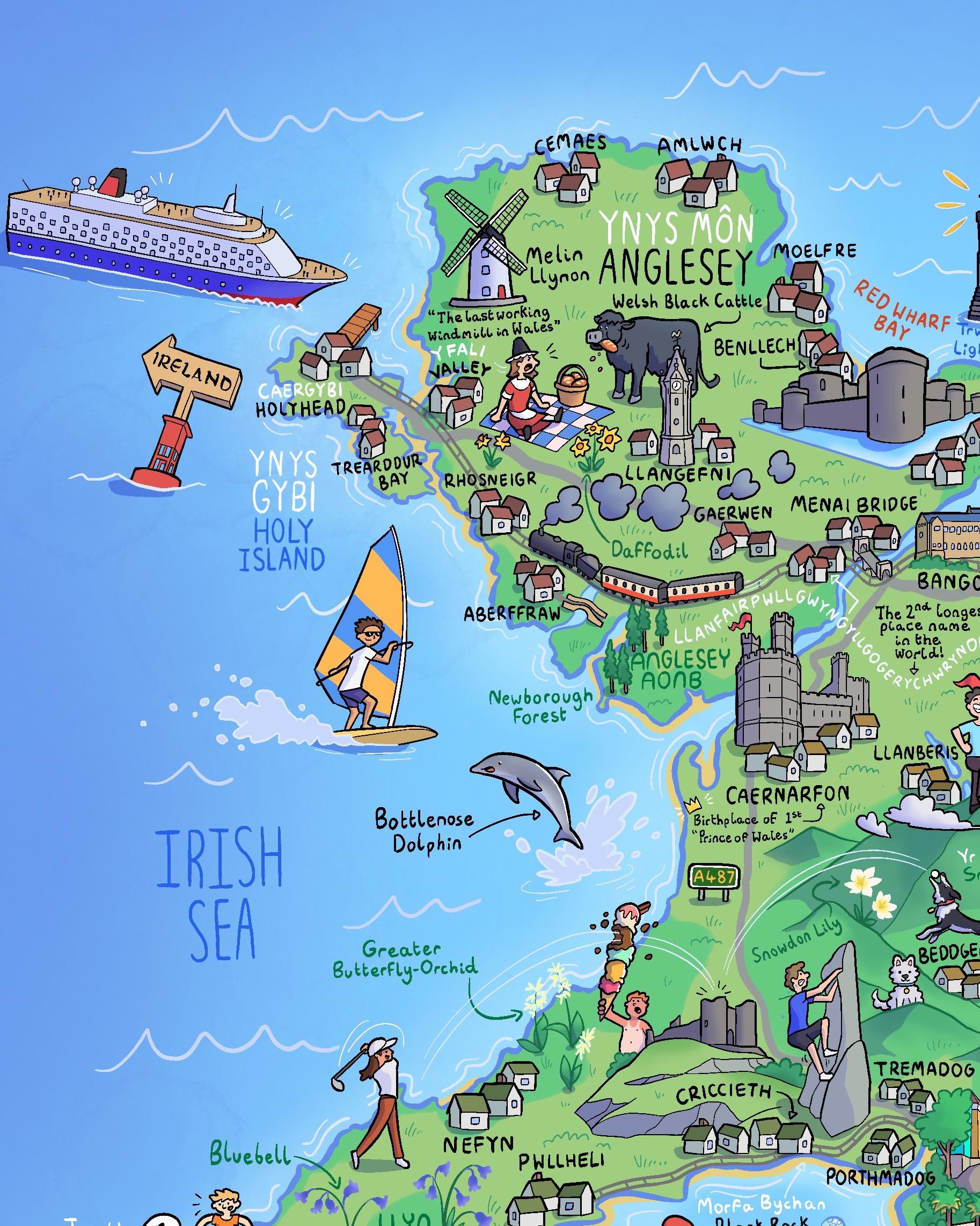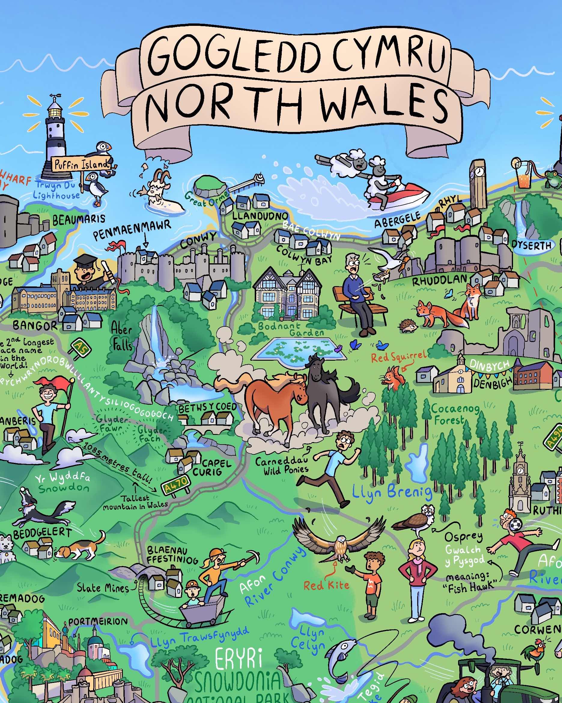 Celebrate the beauty and charm of North Wales with this hand-illustrated map print, featuring iconic landmarks like Snowdon (Yr Wyddfa), Conwy Castle, Llandudno Pier and Portmeirion, all drawn in a fun, detailed style.