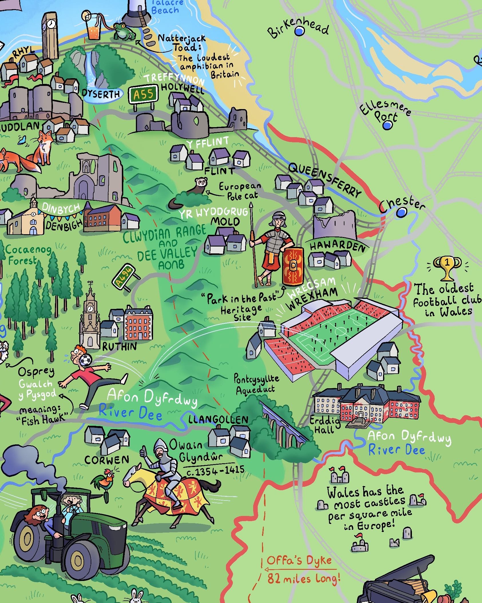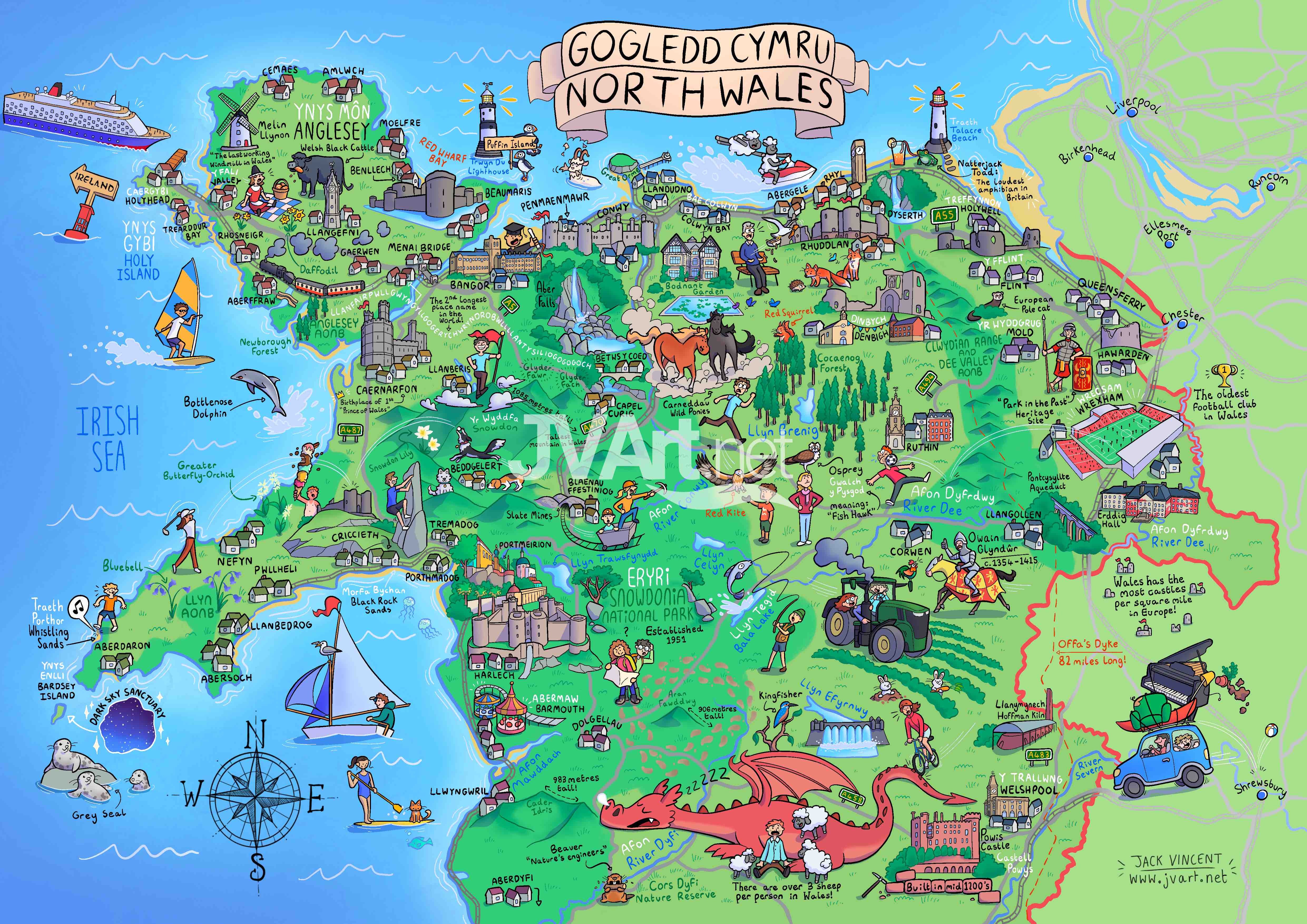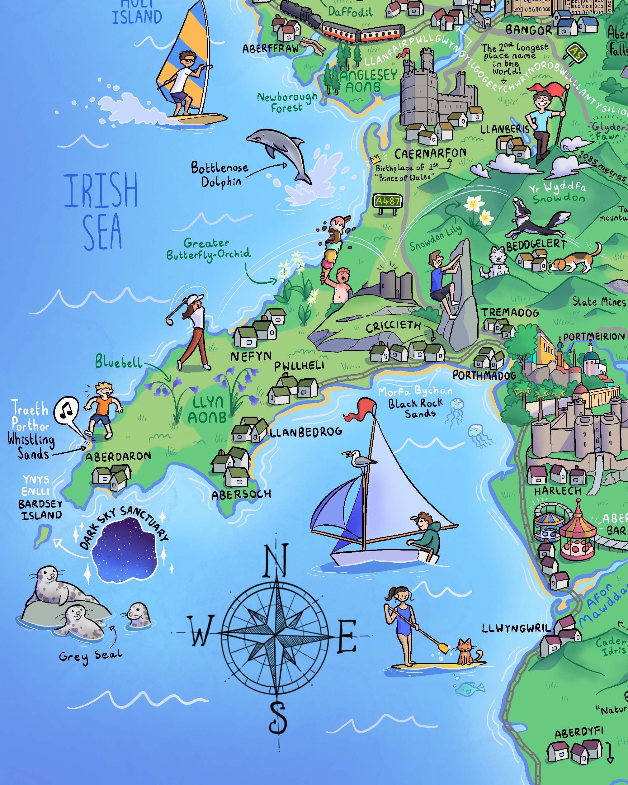 Celebrate the beauty and charm of North Wales with this hand-illustrated map print, featuring iconic landmarks like Snowdon (Yr Wyddfa), Conwy Castle, Llandudno Pier and Portmeirion, all drawn in a fun, detailed style.